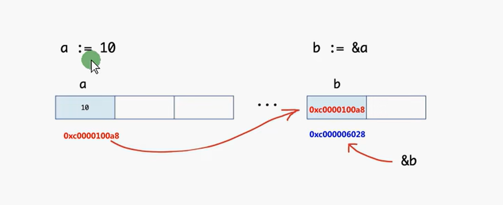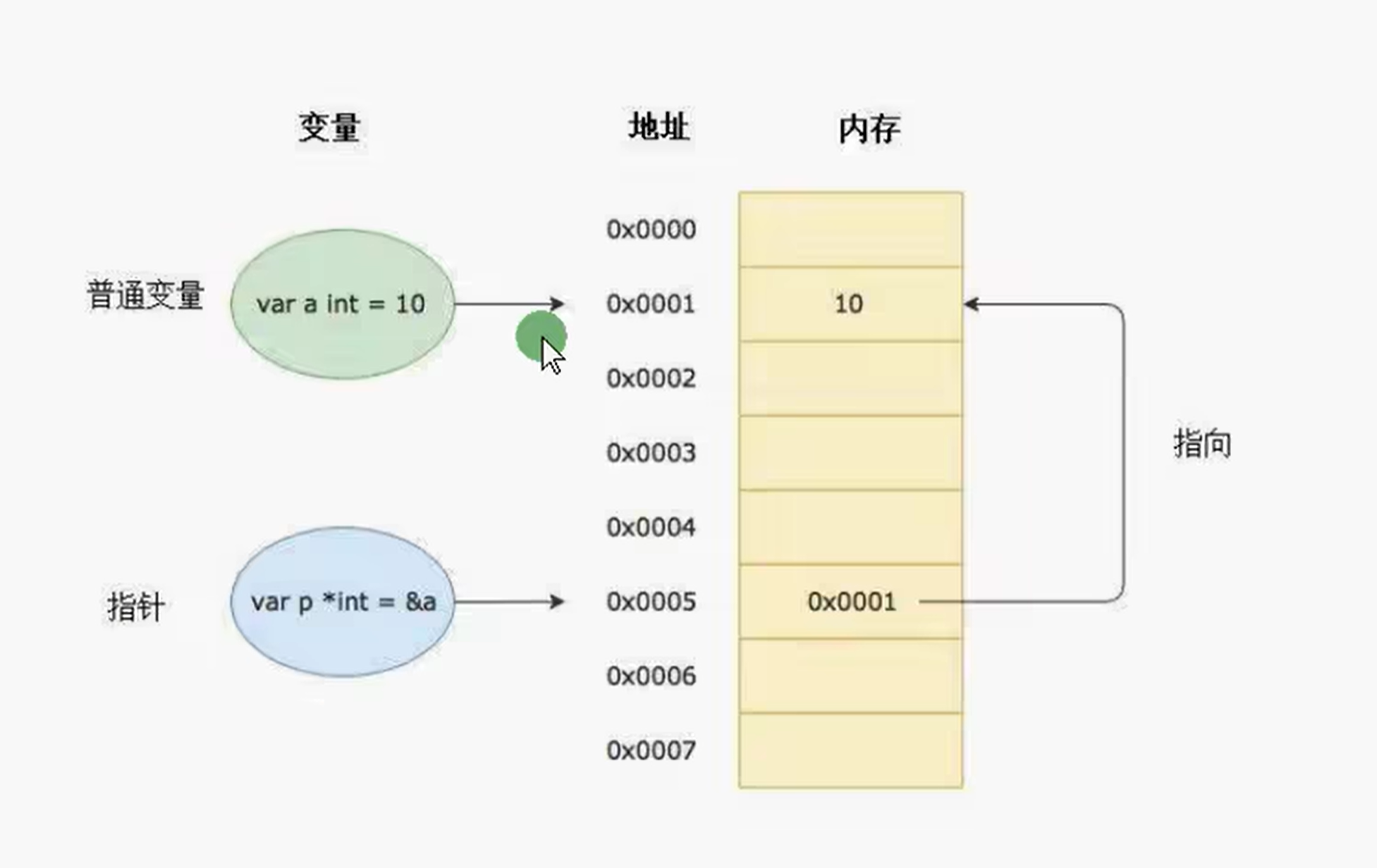 ## 关于指针 **指针**也是一个变量,但它是一个特殊的变量,它存储的数据不是一个普通的值,而是另一个变量的内存地址。  ``` func main() { var a int = 20 var b *int = &a fmt.Printf("b: %v\n", b) fmt.Printf("&a %v", &a) } /* b: 0xc0000120a8 &a 0xc0000120a8 */ ``` ## 指针地址和指针类型 Go语言中使用&字符放在变量前面对比变量进行**取地址**操作。Go语言中的值类型(int,float,bool,string,array,struct)都有对应的指针类型。  &b 也有自己对应的内存地址 ## 指针取值 ``` func main() { var a int = 20 var b *int = &a fmt.Printf("b: %v\n", b) fmt.Printf("&a %v \n", &a) fmt.Printf("b: %v\n", *b) } ``` ## make 和 new ### new 函数分配内存 new 是一个内置的函数 ``` func new(Type) *Type ``` 其中: * Type 表示类型,new函数只接受一个参数,这个参数是一个类型 * *Type表示类型指针,new函数返回一个指向该类型内存地址的指针。