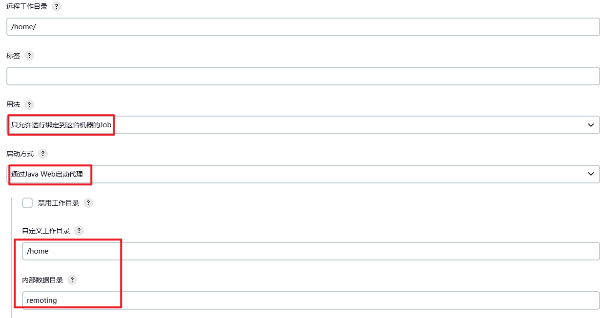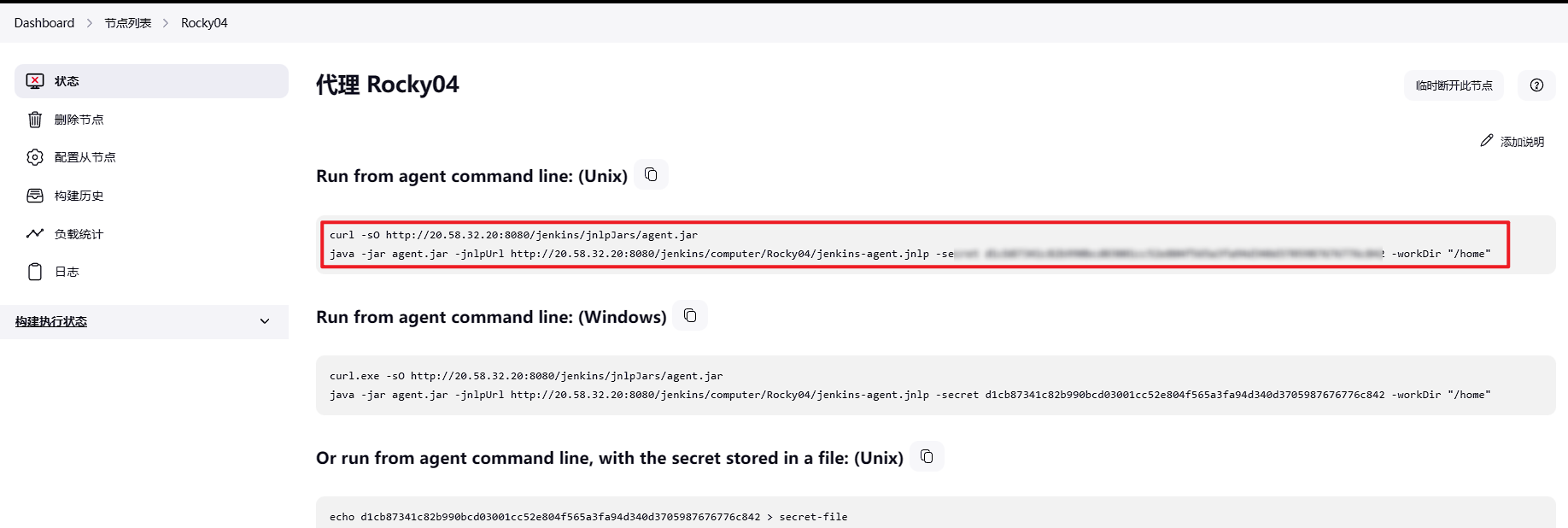 ## 启用代理 端口可以自己指定  ## 添加节点  `参数说明:` * Name(名称):即节点名称 * Description(描述):介绍该节点的作用,如Docker构建 * of executors(并发构建数):定义该节点可以执行多少并发构建作业 * Remote root directory(远程工作目录):节点用来运行构建的作业的专用目录 * Labels(标签):可以为一组节点设置同一标签,然后配置构建作业只运行在某个特定标签的从节点上。如操作系统(CentOS、Ubuntu、SUSE) * Usage(用法):配置使用该节点的程度 * 用法一:尽可能的使用这个节点(最常用) 当不指定执行机的时候,会去所有配置该用法的机器中找一台运行Job。 如脚本式Pipeline中写了node,就会随机选取一台执行机 * 用法二:只允许运行绑定到这台机器的Job  如果Job不指定该执行机,那么Job不会运行到这台执行机上 填写完毕保存后,跳转如下界面:  ## 添加 systemd ``` cat > /usr/lib/systemd/system/jenkins-slave.service <<EOF [Unit] Description=jenkins slave service [Service] Type=simple ExecStart=/usr/bin/java -jar /root/agent.jar -jnlpUrl http://192.168.1.117:9095/computer/node1/jenkins-agent.jnlp -secret edbe4253a3dfbd81df0a114041662c5f5b6e05255c45189919952f03acdad945 -workDir "/data" Restart=always KillMode=process RestartSec=0 [Install] WantedBy=multi-user.target EOF systemctl daemon-reload systemctl start jenkins-slave systemctl enablejenkins-slave systemctl status jenkins-slave ```