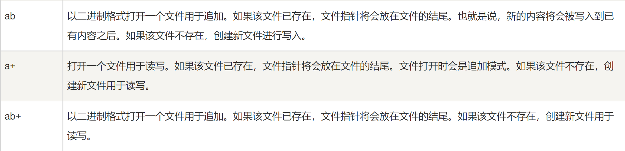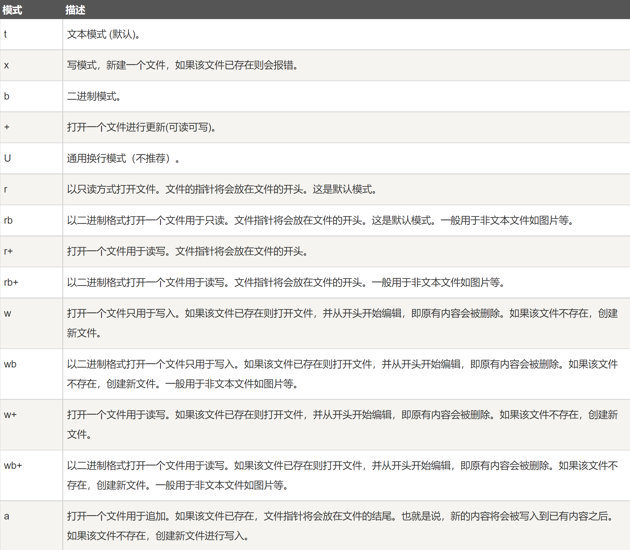 ## 读取键盘输入 Python提供了两个内置函数从标准输入读入一行文本,默认的标准输入是键盘。如下: * raw_input * input ### raw_input函数 raw_input([prompt]) 函数从标准输入读取一个行,并返回一个字符串(去掉结尾的换行符): ``` #!/usr/bin/python # -*- coding: UTF-8 -*- str = raw_input("请输入:") print "你输入的内容是: ", str ``` 这将提示你输入任意字符串,然后在屏幕上显示相同的字符串。当我输入"Hello Python!",它的输出如下: ``` 请输入:Hello Python! 你输入的内容是: Hello Python! ``` ## 打开和关闭文件 现在,您已经可以向标准输入和输出进行读写。现在,来看看怎么读写实际的数据文件。 Python 提供了必要的函数和方法进行默认情况下的文件基本操作。你可以用 file 对象做大部分的文件操作。 ### open 函数 你必须先用Python内置的open()函数打开一个文件,创建一个file对象,相关的方法才可以调用它进行读写。 语法: ``` file object = open(file_name [, access_mode][, buffering]) ``` 各个参数的细节如下: * file_name:file_name变量是一个包含了你要访问的文件名称的字符串值。 * access_mode:access_mode决定了打开文件的模式:只读,写入,追加等。所有可取值见如下的完全列表。这个参数是非强制的,默认文件访问模式为只读(r)。 * buffering:如果buffering的值被设为0,就不会有寄存。如果buffering的值取1,访问文件时会寄存行。如果将buffering的值设为大于1的整数,表明了这就是的寄存区的缓冲大小。如果取负值,寄存区的缓冲大小则为系统默认。 不同模式打开文件的完全列表:   下图很好的总结了这几种模式:   --- 使用 open() 打开文件时,默认采用 GBK 编码。但当要打开的文件不是 GBK 编码格式时,可以在使用 open() 函数时,手动指定打开文件的编码格式,例如: ``` file = open("a.txt",encoding="utf-8") ``` 注意,手动修改 encoding 参数的值,仅限于文件以文本的形式打开,也就是说,以二进制格式打开时,不能对 encoding 参数的值做任何修改,否则程序会抛出 ValueError 异常,如下所示: ``` ValueError: binary mode doesn't take an encoding argument ``` ## File对象的属性 一个文件被打开后,你有一个file对象,你可以得到有关该文件的各种信息。 以下是和file对象相关的所有属性的列表:  ``` #!/usr/bin/python # -*- coding: UTF-8 -*- # 打开一个文件 fo = open("foo.txt", "w") print "文件名: ", fo.name print "是否已关闭 : ", fo.closed print "访问模式 : ", fo.mode print "末尾是否强制加空格 : ", fo.softspace ``` 以上实例输出结果: ``` 文件名: foo.txt 是否已关闭 : False 访问模式 : w 末尾是否强制加空格 : 0 ``` ## close()方法 File 对象的 close()方法刷新缓冲区里任何还没写入的信息,并关闭该文件,这之后便不能再进行写入。 当一个文件对象的引用被重新指定给另一个文件时,Python 会关闭之前的文件。用 close()方法关闭文件是一个很好的习惯。 语法: ``` fileObject.close() ``` ``` #!/usr/bin/python # -*- coding: UTF-8 -*- # 打开一个文件 fo = open("foo.txt", "w") print "文件名: ", fo.name # 关闭打开的文件 fo.close() ``` ``` 文件名: foo.txt ``` ## 读写文件 file对象提供了一系列方法,能让我们的文件访问更轻松。来看看如何使用read()和write()方法来读取和写入文件。 ### with as 使用 with as 可以省去 close 步骤 ``` with open("//file_path/","r",encoding="utf-8") as file : str=file.read() # 读取全部 file.readlines()# 逐行读取 print(str) ``` ### write()方法 write()方法可将任何字符串写入一个打开的文件。需要重点注意的是,Python字符串可以是二进制数据,而不是仅仅是文字。 write()方法不会在字符串的结尾添加换行符('\n'): 语法: ``` fileObject.write(string) ``` 在这里,被传递的参数是要写入到已打开文件的内容。 ``` #!/usr/bin/python # -*- coding: UTF-8 -*- # 打开一个文件 fo = open("foo.txt", "w") fo.write( "www.runoob.com!\nVery good site!\n") # 关闭打开的文件 fo.close() ``` 上述方法会创建foo.txt文件,并将收到的内容写入该文件,并最终关闭文件。如果你打开这个文件,将看到以下内容: ``` $ cat foo.txt www.runoob.com! Very good site! ``` ### read()方法 read()方法从一个打开的文件中读取一个字符串。需要重点注意的是,Python字符串可以是二进制数据,而不是仅仅是文字。 语法: ``` fileObject.read([count]) ``` 在这里,被传递的参数是要从已打开文件中读取的字节计数。该方法从文件的开头开始读入,如果没有传入count,它会尝试尽可能多地读取更多的内容,很可能是直到文件的末尾。 这里我们用到以上创建的 foo.txt 文件。 ``` #!/usr/bin/python # -*- coding: UTF-8 -*- # 打开一个文件 fo = open("foo.txt", "r+") str = fo.read(10) print "读取的字符串是 : ", str # 关闭打开的文件 fo.close() ``` ## 文件位置: ### 文件定位 tell()方法告诉你文件内的当前位置, 换句话说,下一次的读写会发生在文件开头这么多字节之后。 seek(offset [,from])方法改变当前文件的位置。Offset变量表示要移动的字节数。From变量指定开始移动字节的参考位置。 如果from被设为0,这意味着将文件的开头作为移动字节的参考位置。如果设为1,则使用当前的位置作为参考位置。如果它被设为2,那么该文件的末尾将作为参考位置。 例子: 就用我们上面创建的文件foo.txt。 ``` #!/usr/bin/python # -*- coding: UTF-8 -*- # 打开一个文件 fo = open("foo.txt", "r+") str = fo.read(10) print "读取的字符串是 : ", str # 查找当前位置 position = fo.tell() print "当前文件位置 : ", position # 把指针再次重新定位到文件开