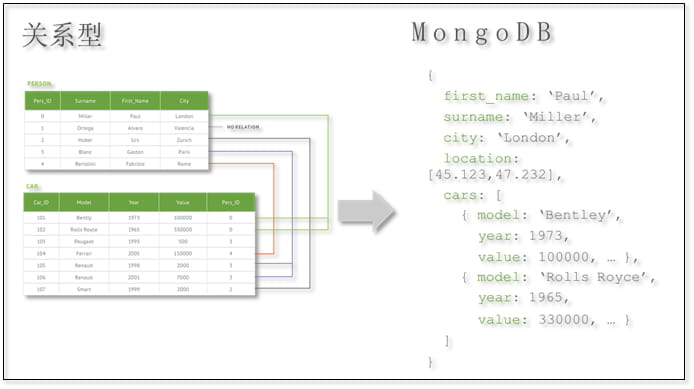 在传统的关系型数据库中,存储方式是以表的形式存放,而在 MongoDB 中,以文档的形式存在。  数据库中的对应关系,及存储形式的说明  # MongoDB 数据存储格式 JSON 格式 JSON 数据格式与语言无关,脱胎于 JavaScript,但目前很多编程语言都支持 JSON 格式数据的生成和解析。JSON 的官方 MIME 类型是 application/json,文件扩展名是 .json。 MongoDB 使用 JSON(JavaScript ObjectNotation)文档存储记录。