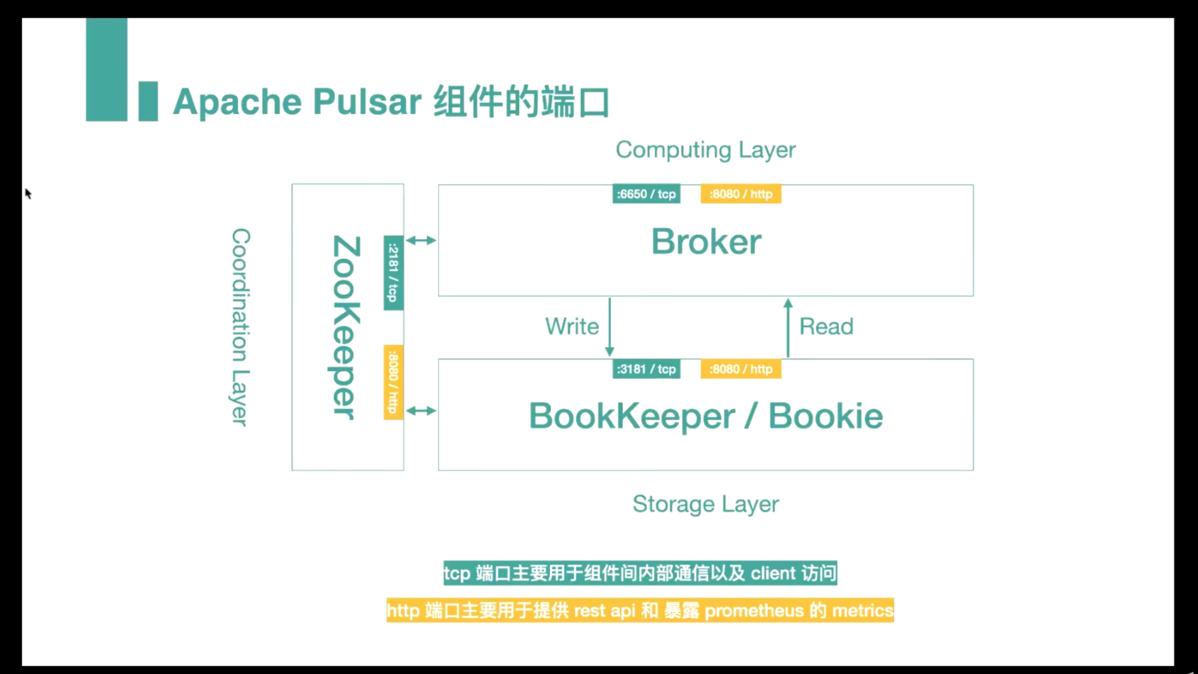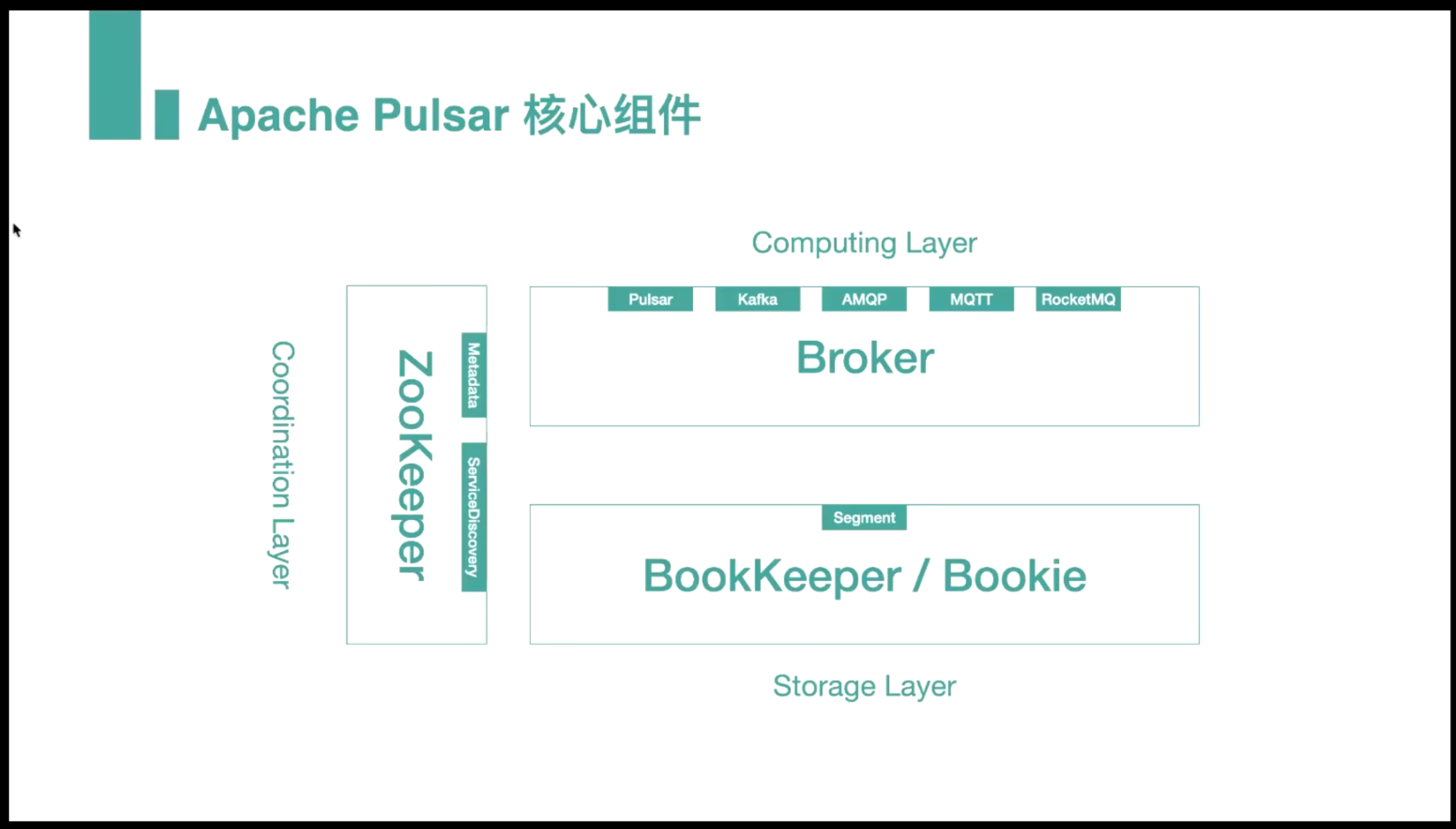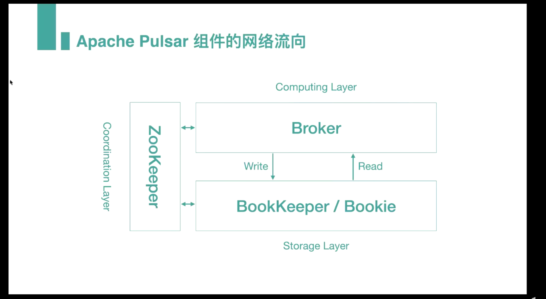 # 架构 * 存储和计算 分离 * 无状态的 pulsar broker 负责处理生产和消费,计算层 * 存储交给 bookkeeper ,存储层 * 元数据交给 zookeeper ## 与kafka 对比 kafka 数据吞吐量是和内存大小挂钩的,使用pagecache技术,数据写入内存,就相当于写到了磁盘中。 pulsar 数据吞吐量是和磁盘IO挂钩的,就是bookie写入的速度。数据会记录到journals。 `kafka 计算与存储是耦合在一起的。` kafka单租户,2.8.0 以后 剥离了 zk。 pulsar 多租户,强依赖zk,天然云原生。