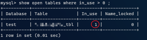 1、确认表是否在被使用 ``` show open tables where in_use > 0 ; ```  2、查看当前数据库进程中正在执行的 SQL 线程信息 ``` # 查看 wait 事务 show processlist; ```  3、当前运行的所有事务 ``` SELECT * FROM information_schema.INNODB_TRX; ``` 4 删除事务 ``` KILL Id ```